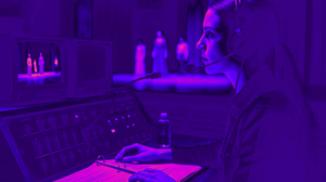 Figure 16: Model of a library inside a reusable plastic food container, lit by a mobile phone light, 2021